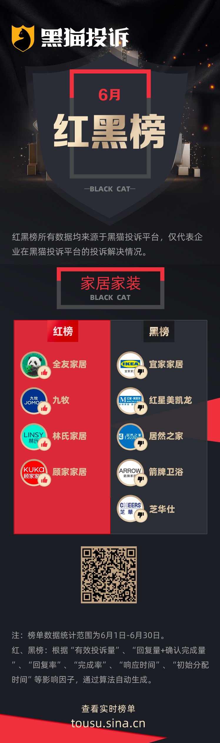 黑猫投诉 【下载黑猫投诉客户端】发布6月企业投诉处理红黑榜单,数据均来源于黑猫投诉平台,反映了企业在黑猫投诉平台的投诉处理解决情况。