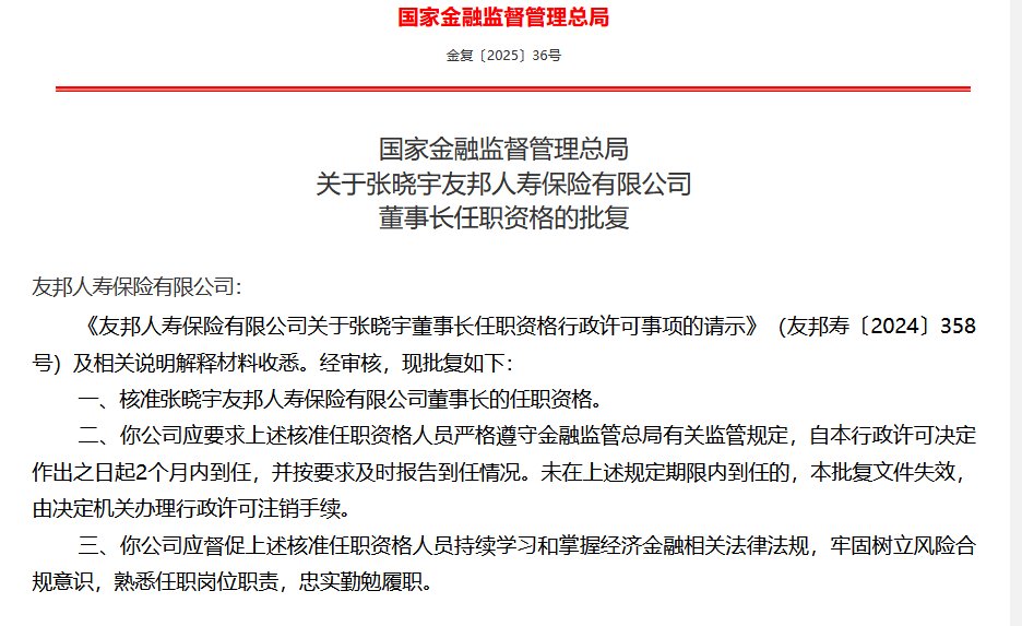 2月26日金融一线消息,国家金融监督管理总局日前发布关于张晓宇友邦人寿保险有限公司董事长任职资格的批复,核准张晓宇友邦人寿保险有限公司董事长的任职资格。