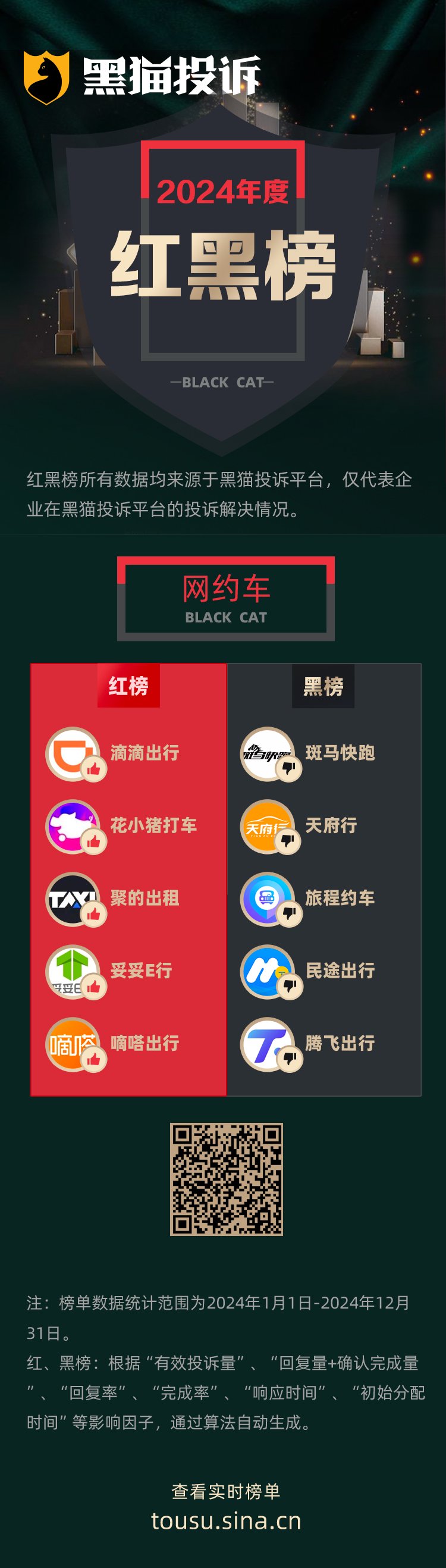 黑猫投诉发布2024年度网约车领域红黑榜榜单:天府行司机不按规定时间出发