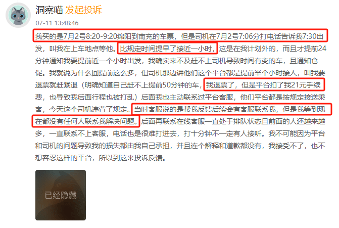 在本年中黑猫投诉平台收到用户反馈称,在天府行平台购买早上8:20的车票,但是司机在当日早7:00才打电话告知用户出发时间为7:30,比规定时间提早了接近一小时,因赶不上车程无奈选择退款后却产生了21元手续费。联系平台客服后对方表示会帮忙反馈,但后续却迟迟没有任何人联系解决问题。截至2024年底,天府行累计投诉303件,回复率为0%。