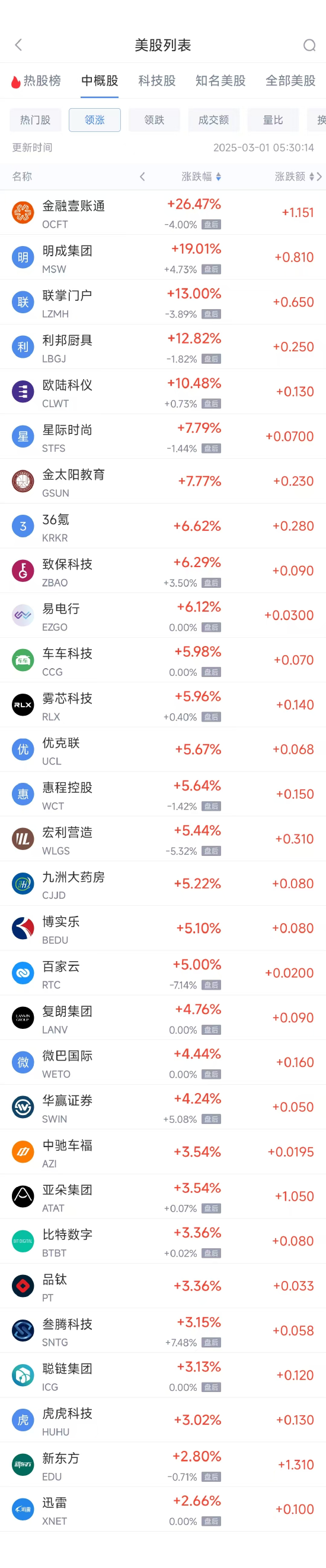 领涨中概股列表:
