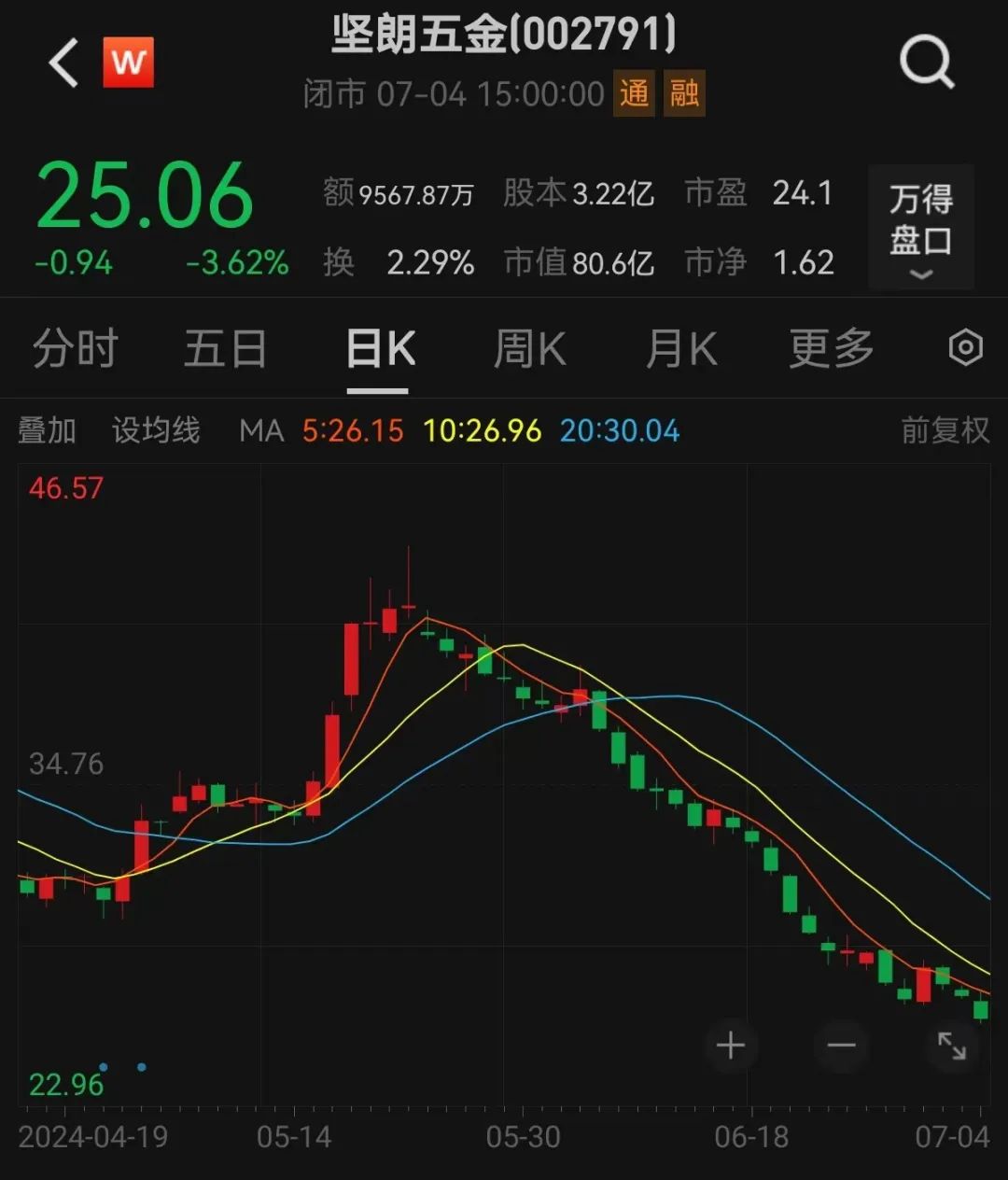 坚朗五金今日跌3.62%,市值80.58亿元,最新股价为25.06元/股,与2021年8月高点238.15元/股相比跌近90%。