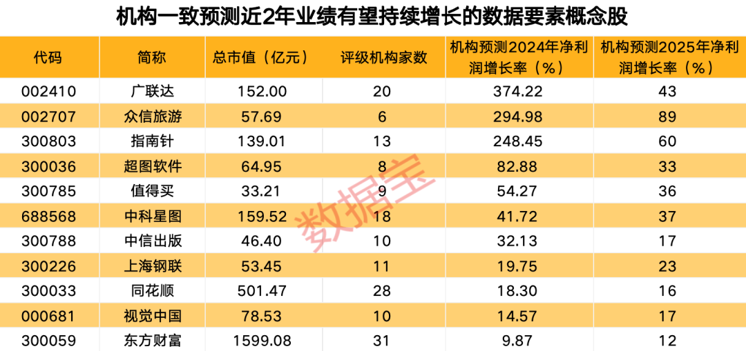 12只数据要素相关概念股获超5家机构评级,其中11股机构一致预测今年、明年全年业绩有望持续增长,其中广联达(002410)、众信旅游(002707)、指南针的机构一致预测2024年净利润增幅均超200%。