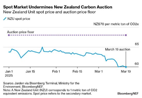 新西兰今年的首次碳竞价以失败告终,未能吸引到任何投标,导致150万个配额未售出。这一结果并不令人意外,因为在竞价前,二级市场上的新西兰碳配额(NZU)的现货价格与新竞价价格下限68新西兰元/吨(39美元/吨)相比仍有很大折价。