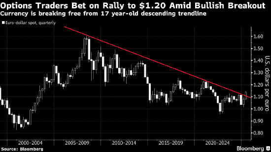 欧元十多年来最快的涨势正在获得牵引力,交易员押注欧元将升至1.20美元,策略师们争相更新他们的预测。