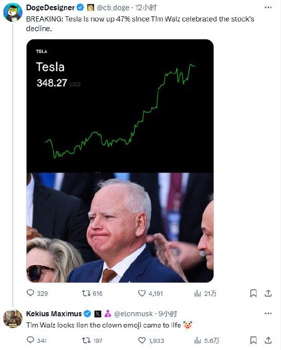 马斯克还回应了粉丝DogeDesigner的一条帖子,后者声称“自蒂姆·沃尔兹庆祝该股下跌以来,特斯拉已上涨了47%。”马斯克说:“蒂姆·沃尔兹看起来就像活过来的笑脸小丑表情符号”。